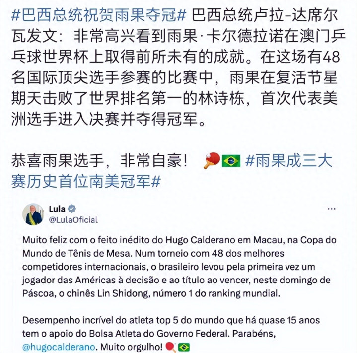 在最近截至的澳门寰宇杯男单决赛中,巴西球员雨果打败林诗栋夺得冠军,登上最高领奖台,成为了巴西体坛的霸道。在这场比赛截至之后,不仅有许多球迷为他奉上道喜体育录像/图片,如今甚而连巴西总统齐亲身在酬酢平台发文,祝贺雨果得到了前前所未有的建立,可谓是排面拉满。